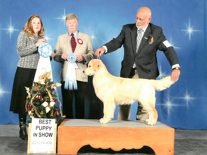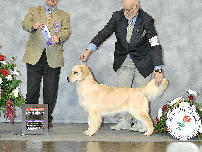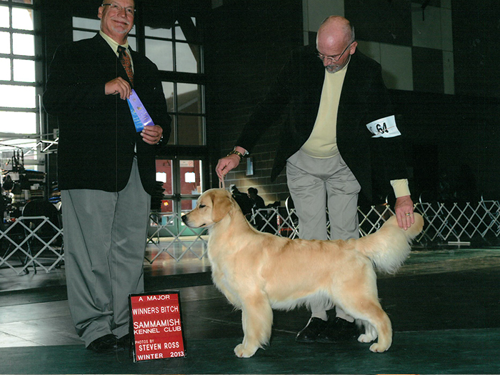 Wayne started donut’s career going Best Puppy In Show at a Canadian Show at 6 months old, her 1st time in the ring. In January, at the 2 weekends of Puyallup and Portland, Donut earned 4 majors in 4 shows and was a new Champion. We had a lovely litter out of her, by our Rooster that should be making their debut in 2016.